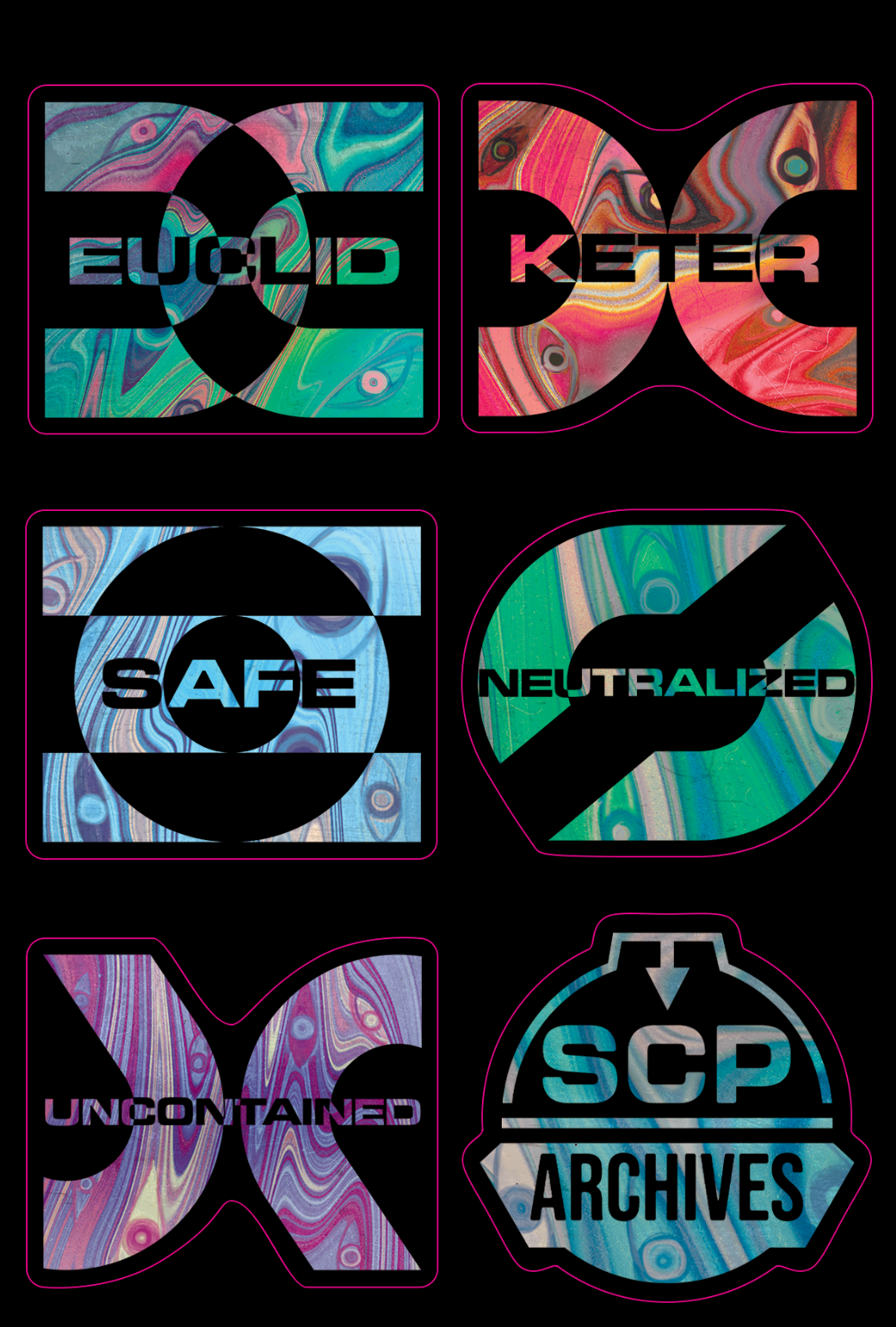And for the folks at $20+, you'll also receive a sticker sheet! It's been several years since our last sticker sheet, and I'm really excited we're doing a new one! This month's design features new containment class icons (you'll see these a lot more in next seasons graphics, keep an eye out)! These will be printed on a clear sheet, so you can apply them to whatever Euclid/Keter/Neutralized objects you have lying around the house!